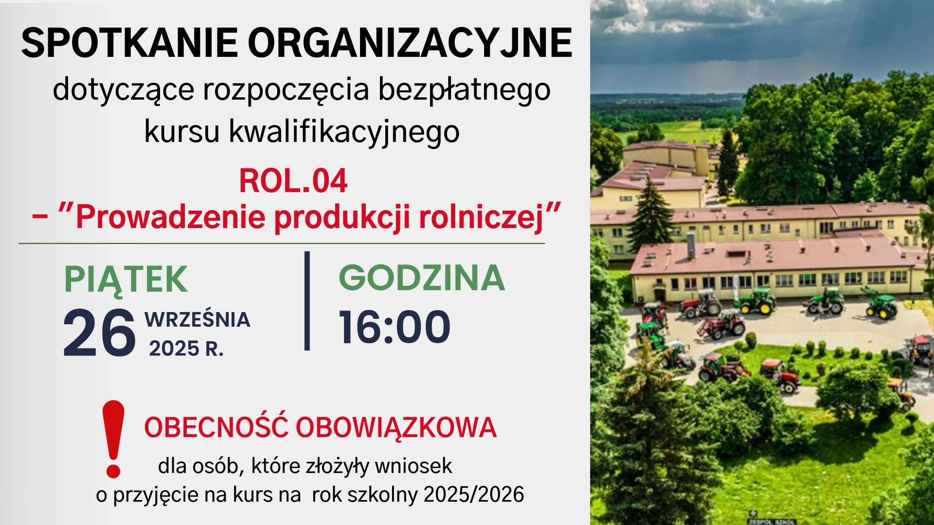 26 września (piątek) 2025r. o godzinie 16:00 w Zespole Szkół Centrum Kształcenia Rolniczego w Sichowie Dużym odbędzie się spotkanie organizacyjne dotyczące rozpoczęcia bezpłatnego kursu kwalifikacyjnego ROL.04 - "Prowadzenie produkcji rolniczej". Obecność obowiązkowa, dla osób, które złożyły Wniosek o przyjęcie na kurs na rok szkolny 2025/2026.