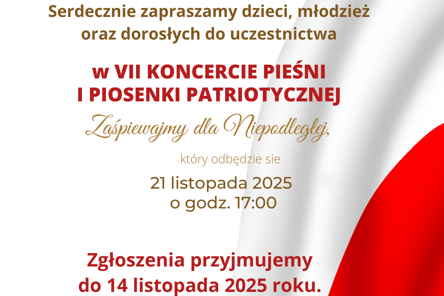 Serdecznie zapraszamy dzieci, młodzież oraz dorosłych do uczestnictwa w VII Koncercie Pieśni i Piosenki Patriotycznej „Zaśpiewajmy dla Niepodległej”!