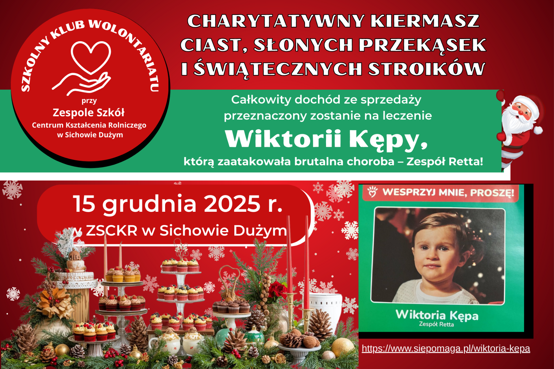 15 grudnia 2025 r. w ZSCKR w Sichowie Dużym odbędzie się wyjątkowy charytatywny kiermasz ciast, słonych przekąsek i świątecznych stroików.