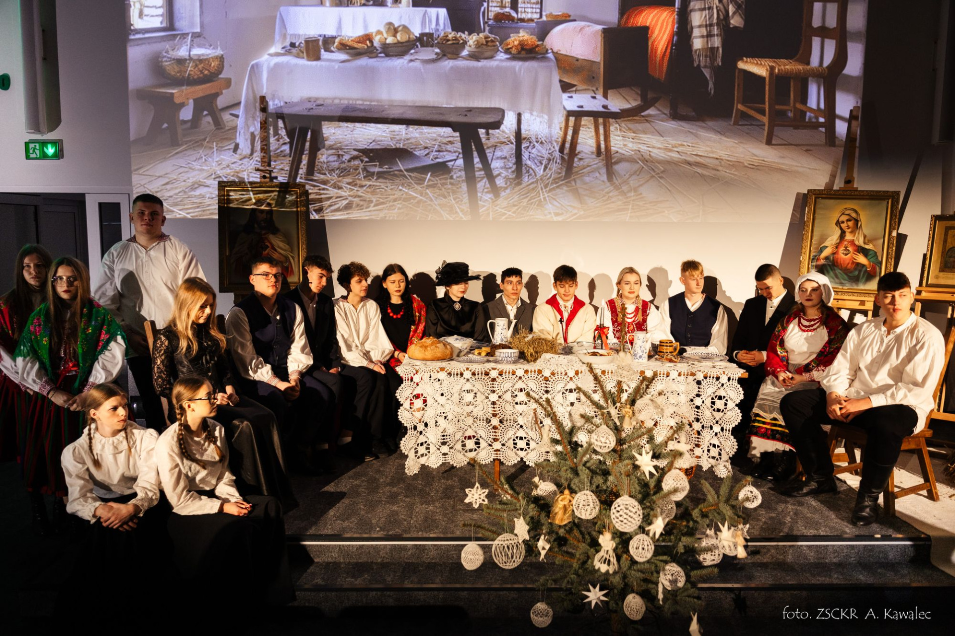 W niezwykłą atmosferę Świąt Bożego Narodzenia wprowadzili nas uczniowie Koła Teatralnego. Tym razem bywalcy bronowickiej chaty zaprosili nas na Wigilię, prezentując tradycje bożonarodzeniowe mocno zakorzenione w naszej kulturze i od wieków obecne na polskiej wsi. I nie zabrakło wspólnych rozmów i snopa słomy, sianka na stole, i potraw dwunastu , miejsca dla wędrowca, słowa Ewangelii, wspólnego kolędowania, i łamania się opłatkiem.